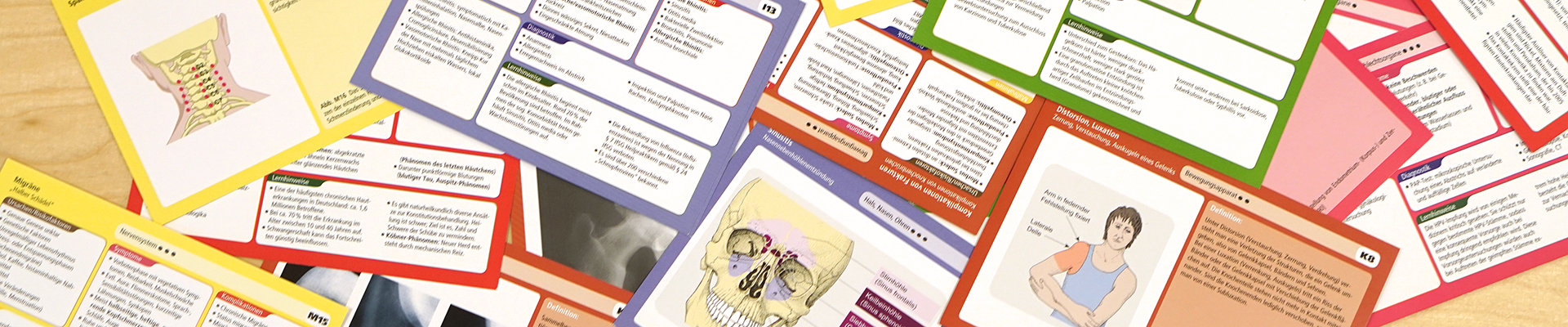 Eine Lernkarte pro Erkrankung: Auf der Vorderseite ein einprägsames Bild mit Definition, auf der Rückseite Diagnostik, Ursachen, Symptomatik, Komplikationen, Lernhinweise und Maßnahmen „Was kann der Heilpraktiker tun?“